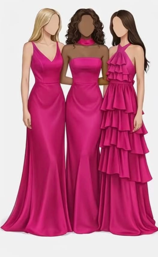 Mulheres, optem por modelos elegantes/gala, aproveitem de vestidos com recortes diferentes e tecidos também! Queremos que se sinta linda e elegante, então pode optar por um vestido longo ou curto desde que siga a estética que citamos. Caso seja de seu interesse, temos indicações de lojas, pode ficar a vontade para pedir ajuda para a noiva! Dentro do tom Fúcsia, Rosa Pink, ou Roxo, ou Vinho, Bolsas de Mão, Verde Esmeralda, ou Dourado.