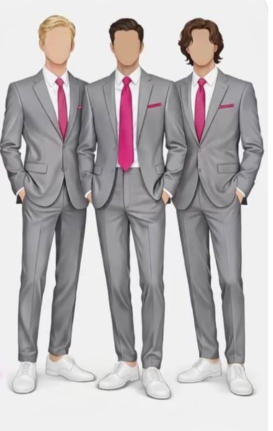 Homens, podem utilizar o terno completo, camisa social com calça social ou até mesmo camisa lisa por baixo do blazer. Desde que siga a estética que citamos, está tudo certo. EVITEM CALÇA JEANS! Pode ficar a vontade para pedir ajuda para o noivo! Tom Cinza do Terno, e Gravata Fúcsia